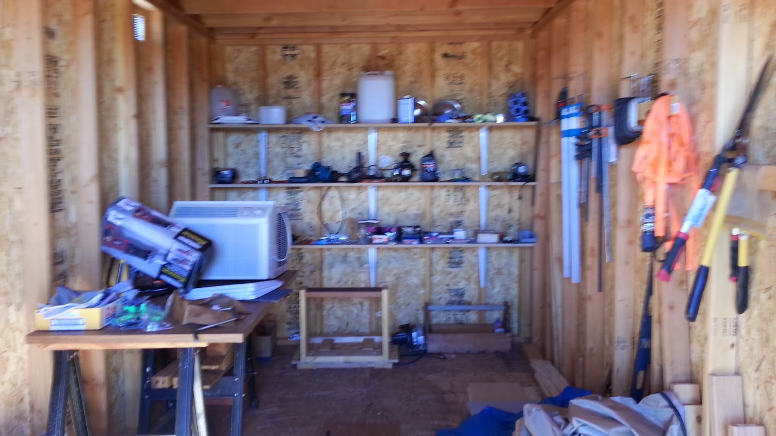 We were working on our storage shelf instead of the roof. Since we need to organize our mess inside the storage, we want to put up shelf. Also Tom wants the roof black foundation coating completely dry before he is going to apply the second coating.